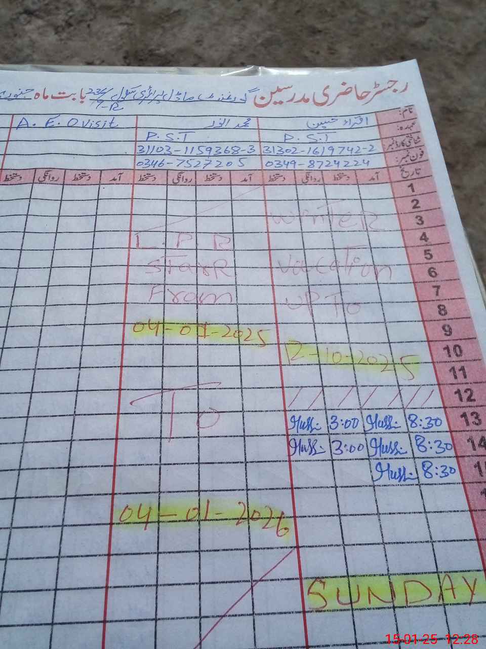 | Name: Iq**** Hu**** Designation: (School Headmaster's/Headmistress's) PST Phone/Cell Number: 03**** |