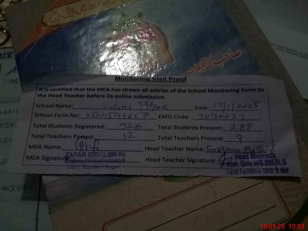 | Attendance Register | Head Teacher | MEA with School | Visit Proof |
