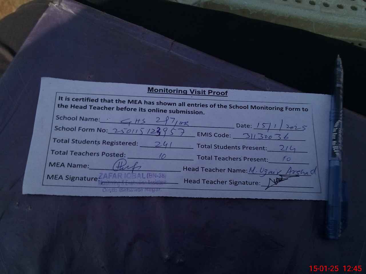 | Attendance Register | Head Teacher | MEA with School | Visit Proof |