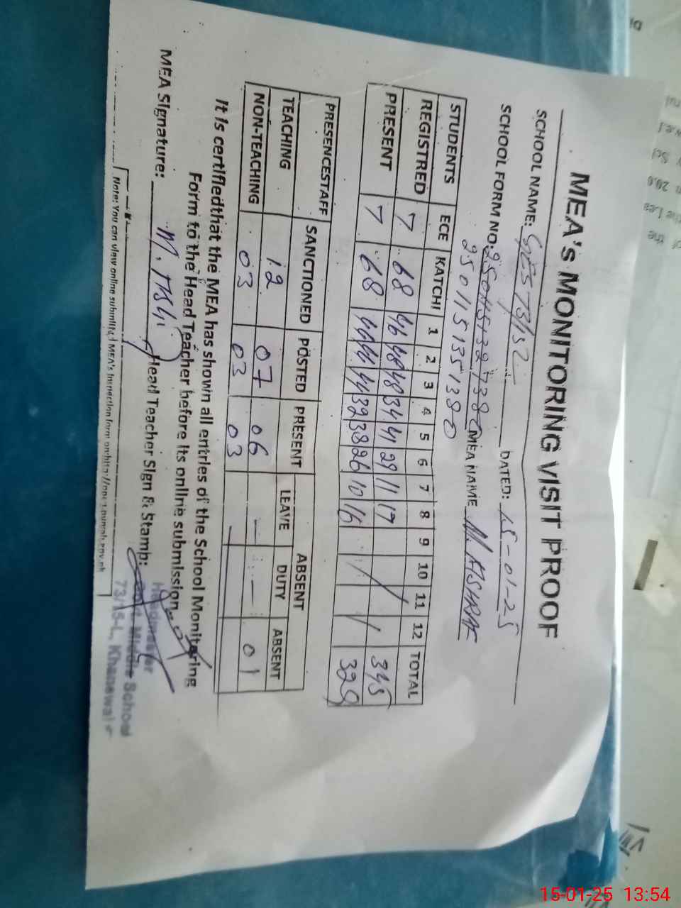 | Attendance Register | Head Teacher | MEA with School | Visit Proof |