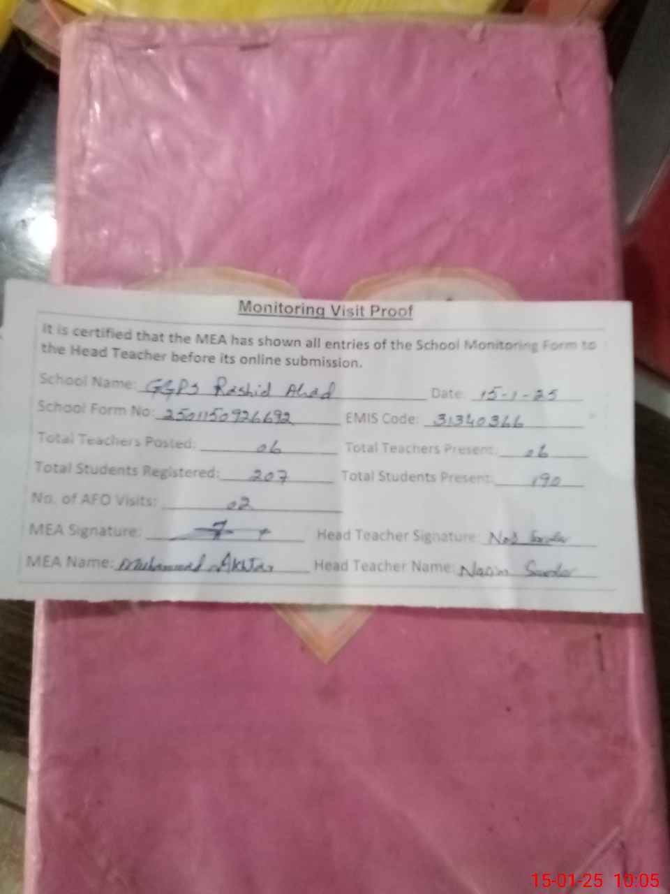 | Attendance Register | Head Teacher | MEA with School | Visit Proof |