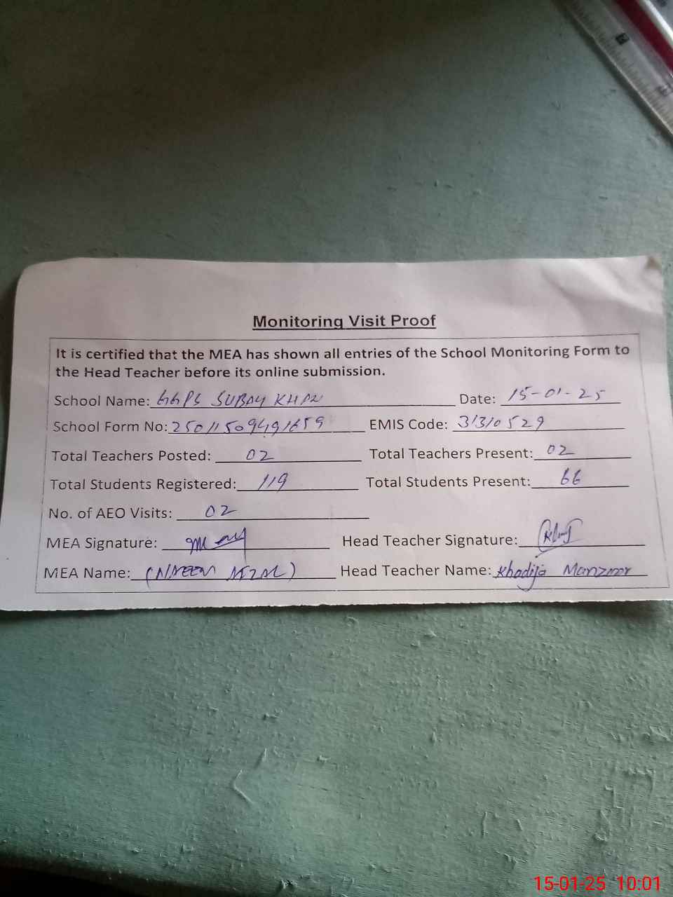 | Attendance Register | Head Teacher | MEA with School | Visit Proof |