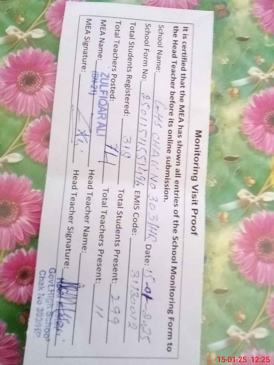 | Attendance Register | Head Teacher | MEA with School | Visit Proof |