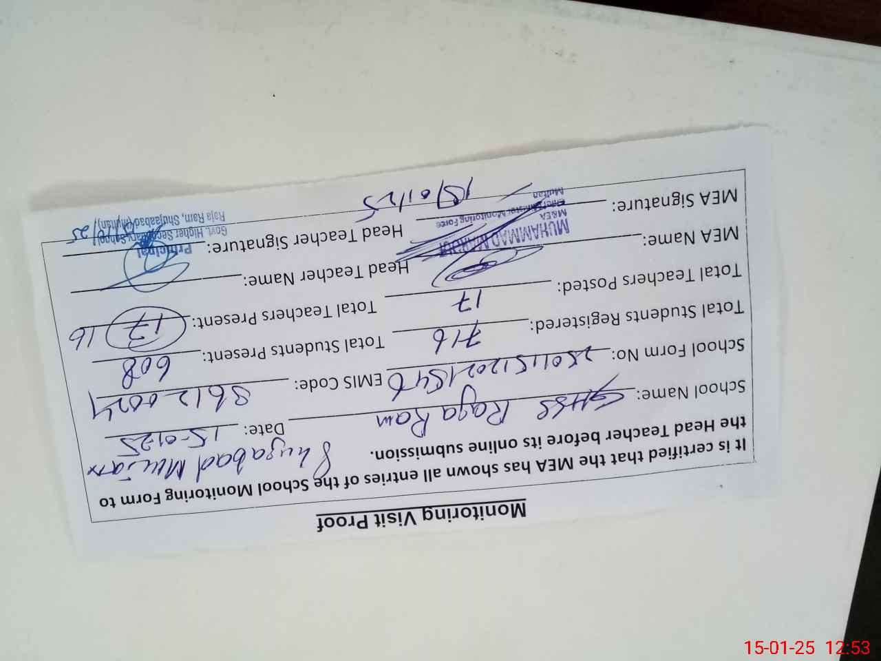 | Attendance Register | Head Teacher | MEA with School | Visit Proof |