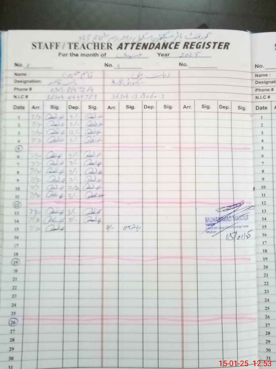 | CNIC | Full Name | Designation | R/C | Absence During Last Calender Month |