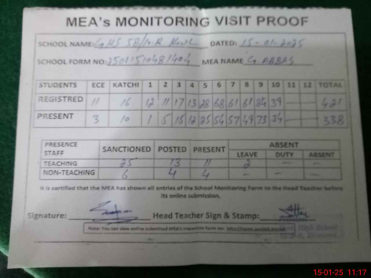 | Attendance Register | Head Teacher | MEA with School | Visit Proof |