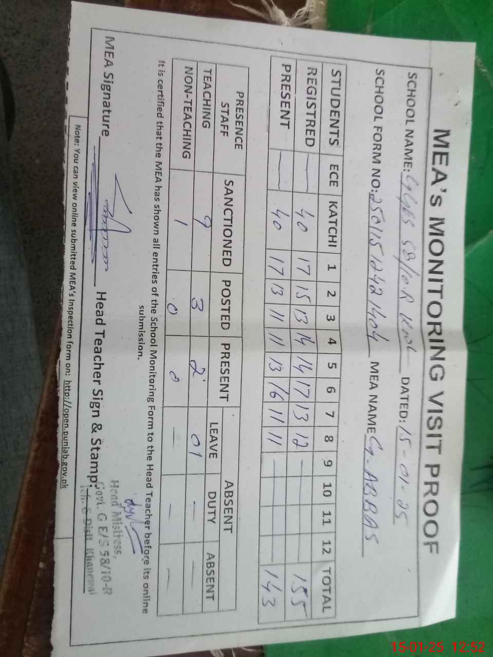 | Attendance Register | Head Teacher | MEA with School | Visit Proof |