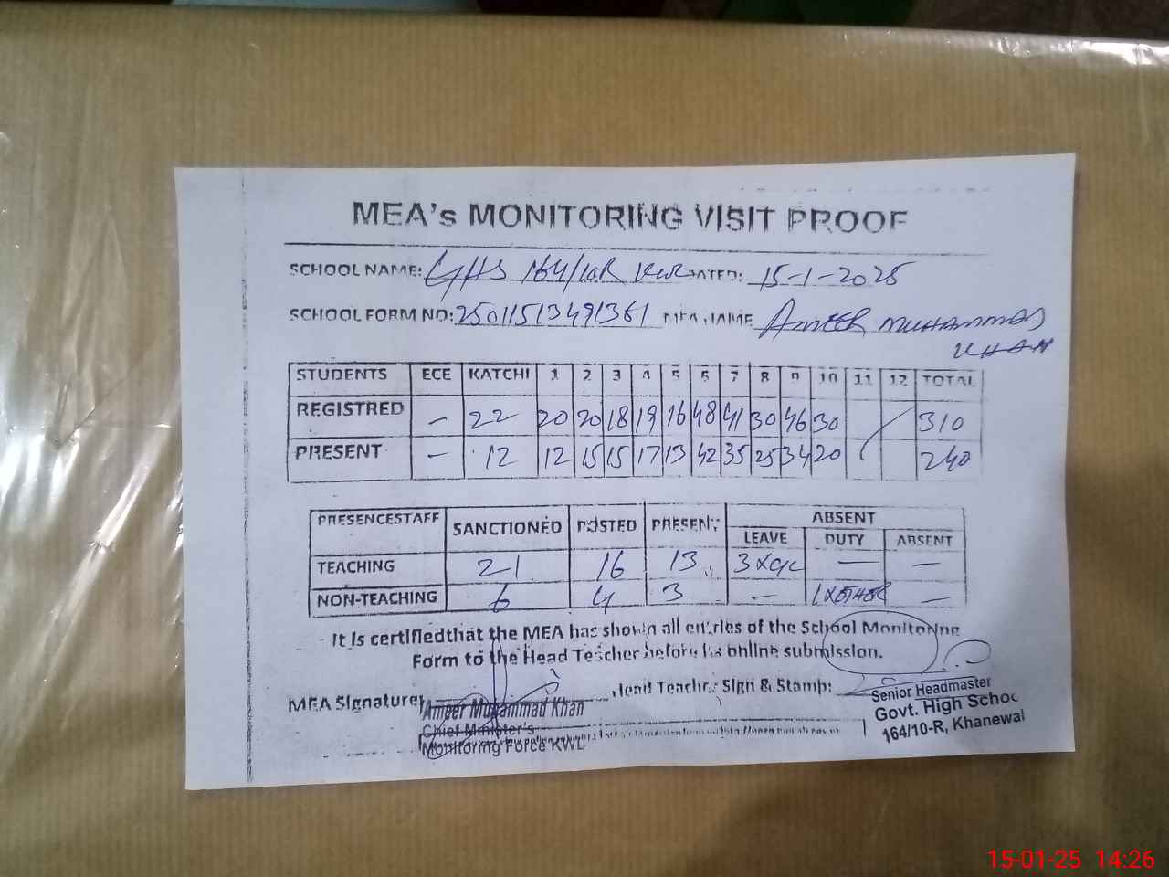 | Attendance Register | Head Teacher | MEA with School | Visit Proof |
