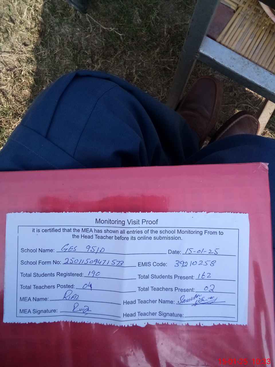 | Attendance Register | Head Teacher | MEA with School | Visit Proof |