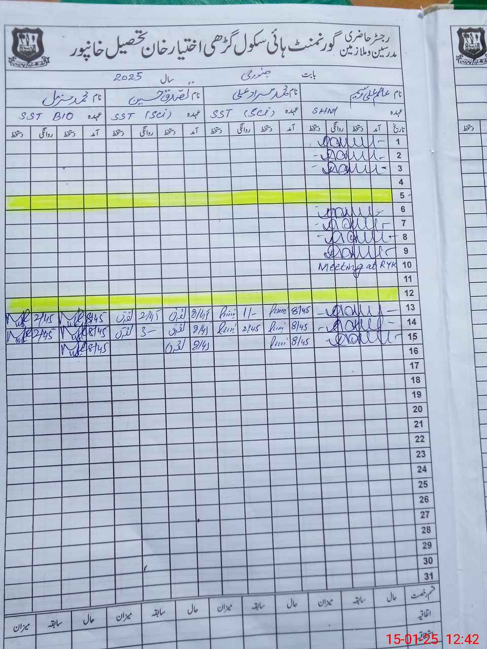 | CNIC | Full Name | Designation | R/C | Absence During Last Calender Month |