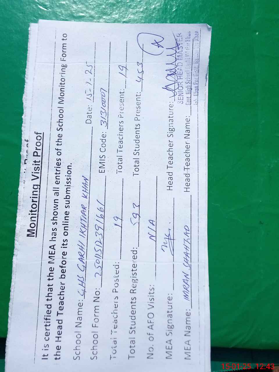 | Attendance Register | Head Teacher | MEA with School | Visit Proof |