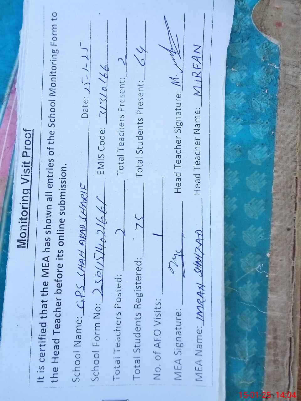 | Attendance Register | Head Teacher | MEA with School | Visit Proof |