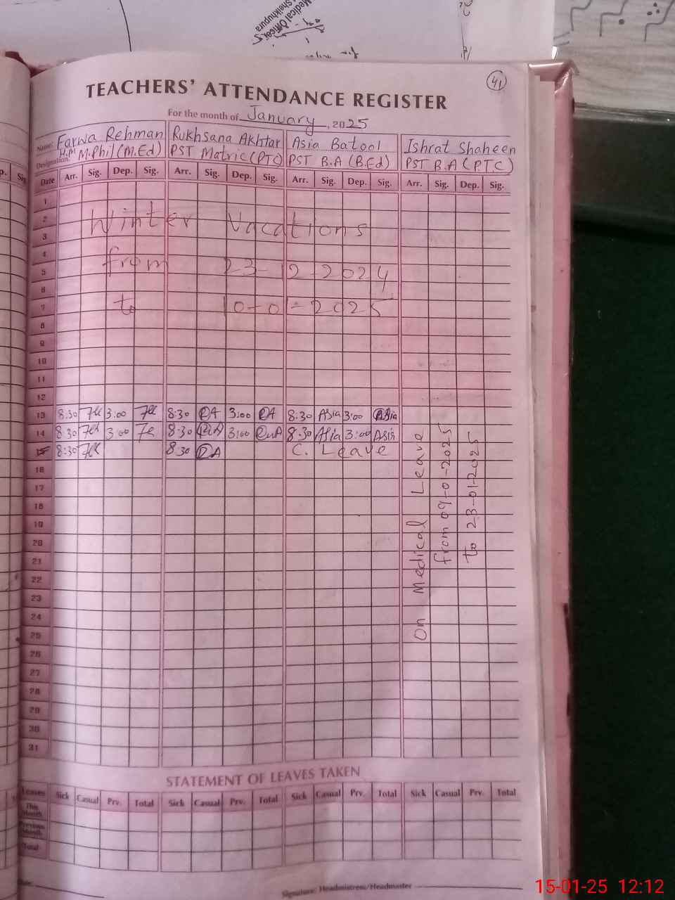 | Leave | Duty | Absent | Maternity | Medical | Ex- Pak |