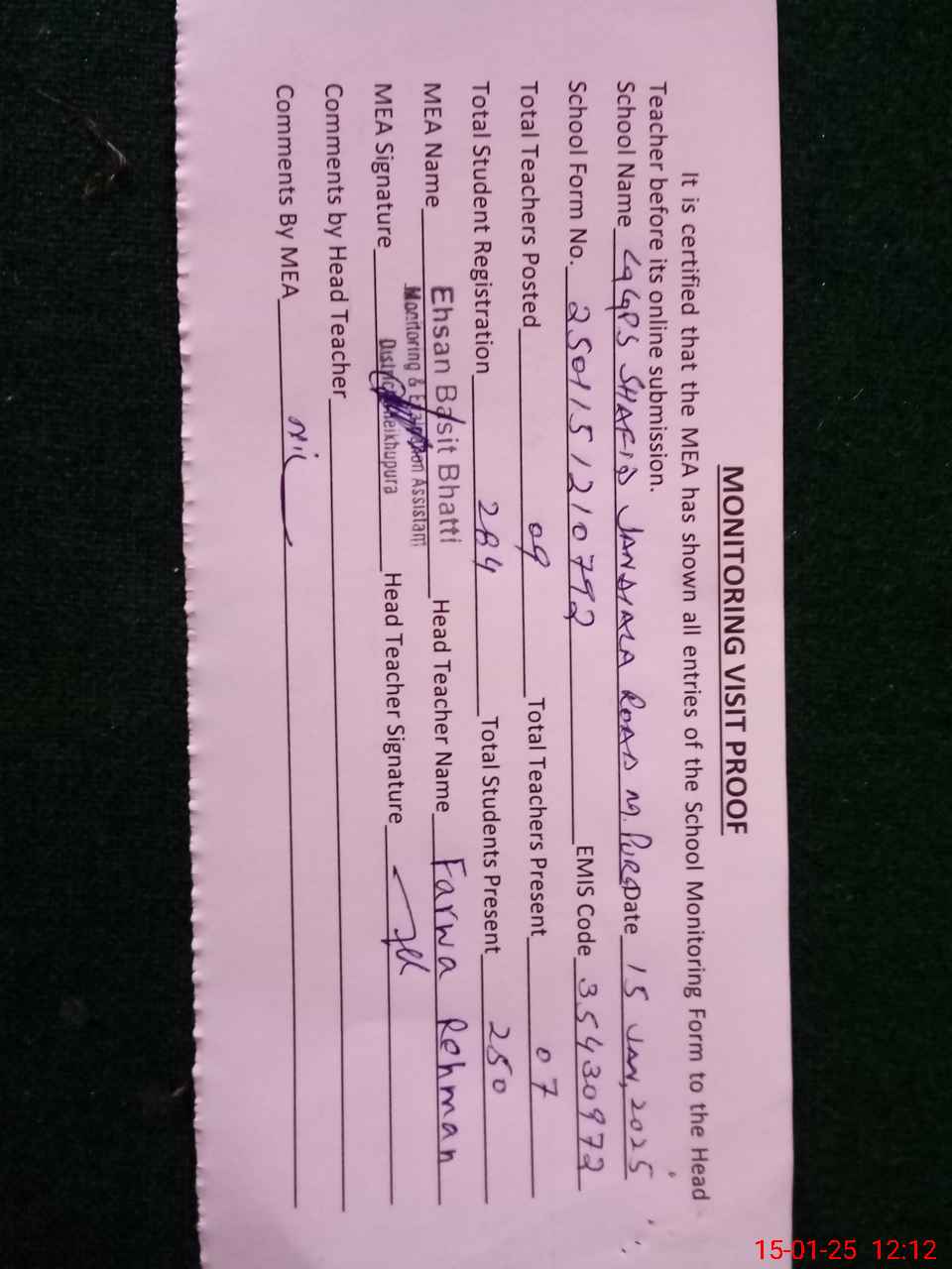 | Attendance Register | Head Teacher | MEA with School | Visit Proof |