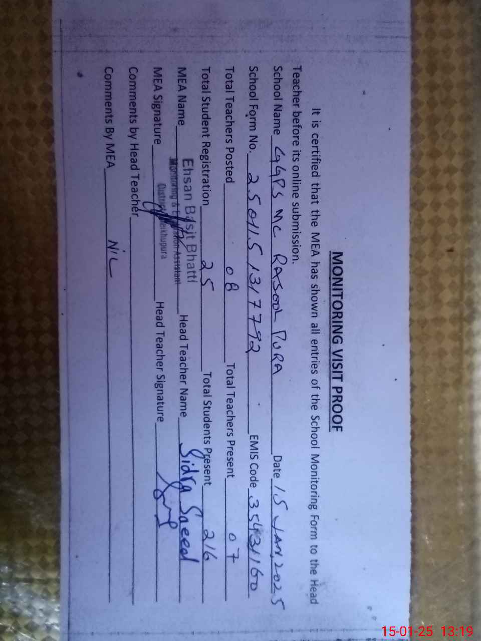 | Attendance Register | Head Teacher | MEA with School | Visit Proof |