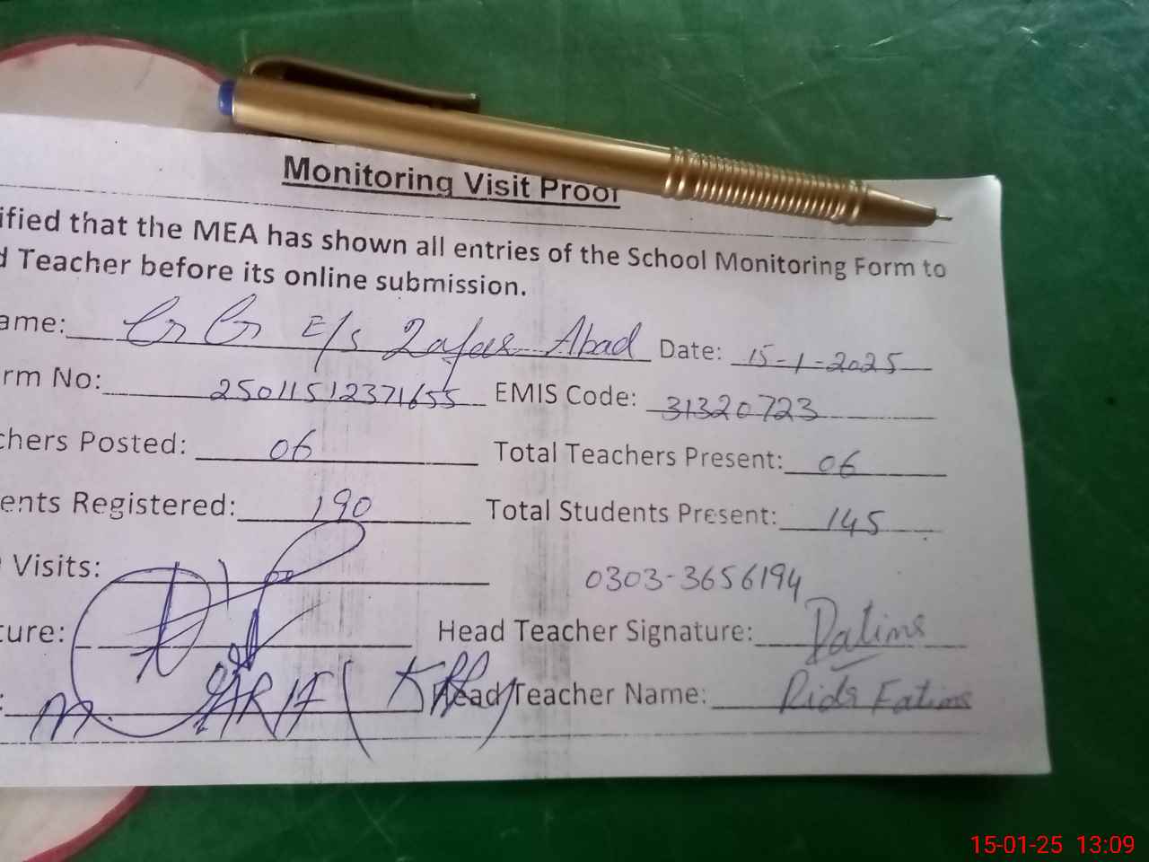 | Attendance Register | Head Teacher | MEA with School | Visit Proof |