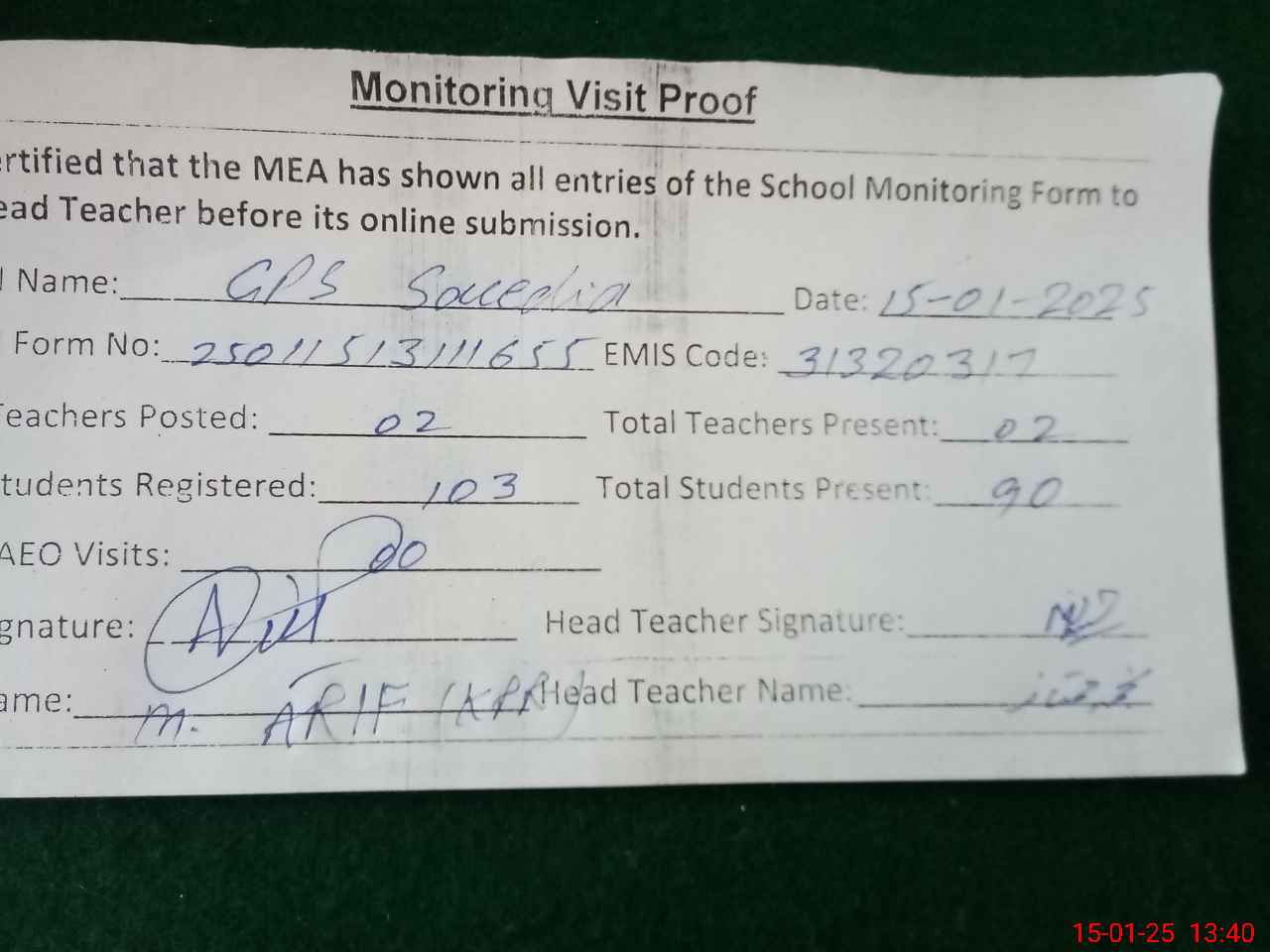 | Attendance Register | Head Teacher | MEA with School | Visit Proof |