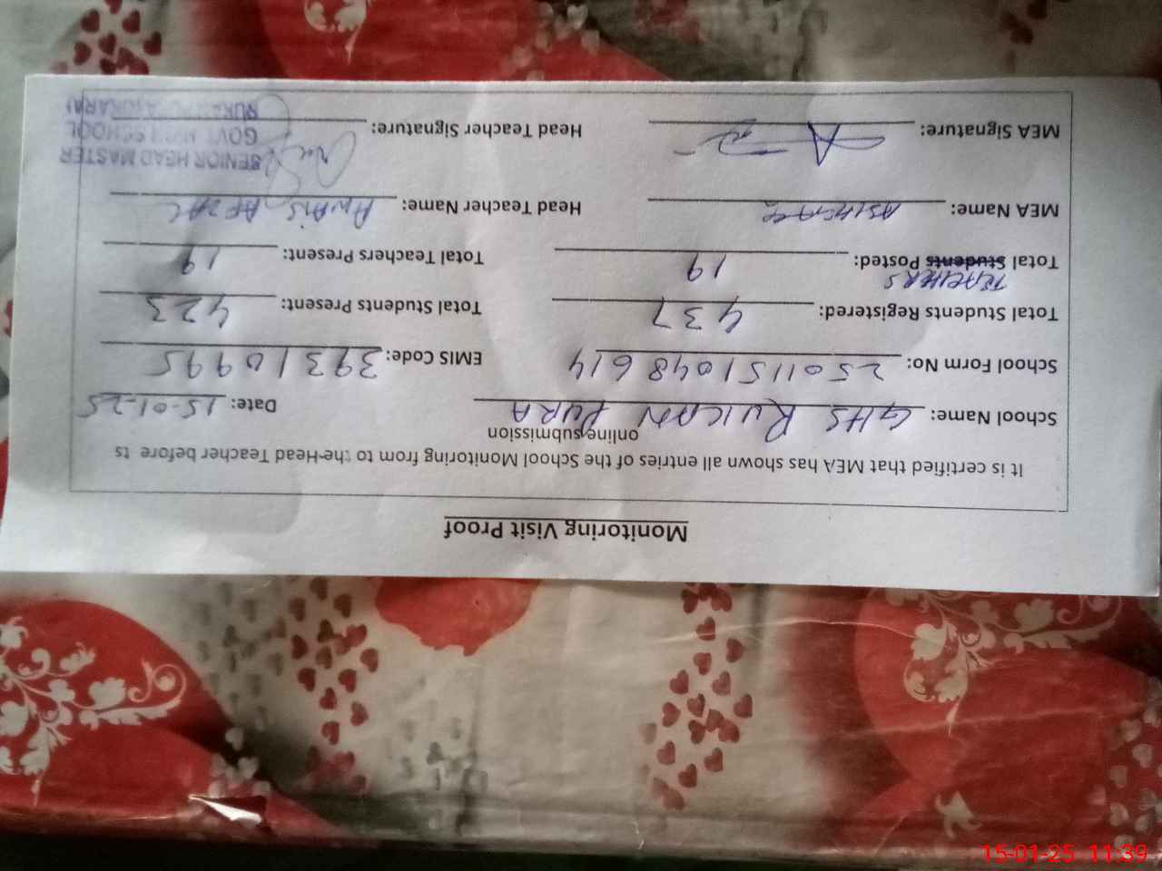 | Certified that this School was Inspected by the Undersigned MEA/DMO Today and the Information Stated Above is as Per Record. | |||||