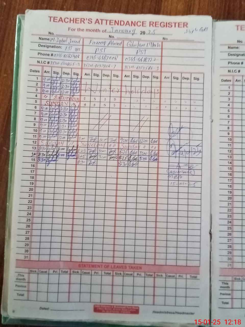 | CNIC | Full Name | Designation | R/C | Absence During Last Calender Month |