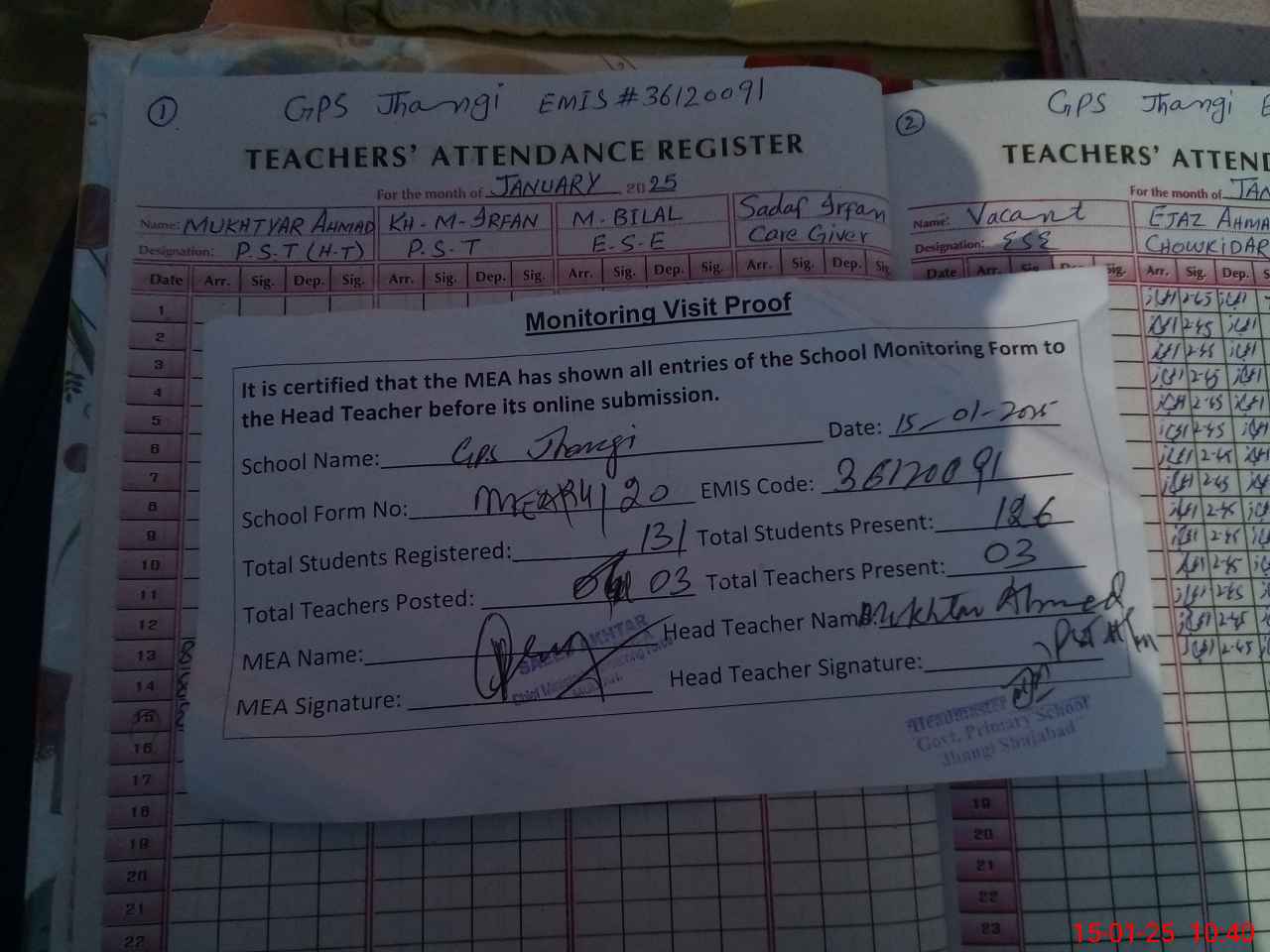 | Attendance Register | Head Teacher | MEA with School | Visit Proof |