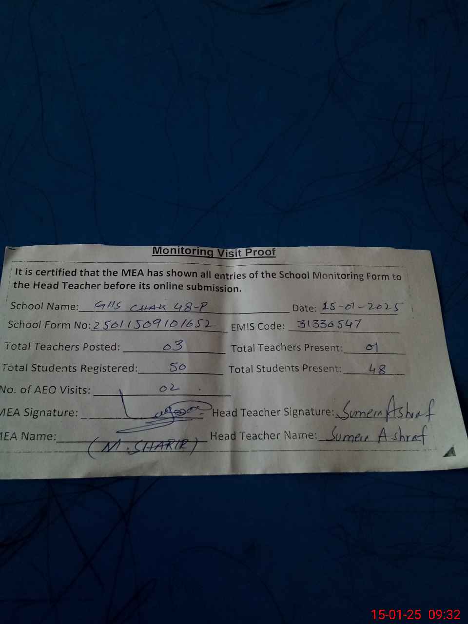 | Attendance Register | Head Teacher | MEA with School | Visit Proof |