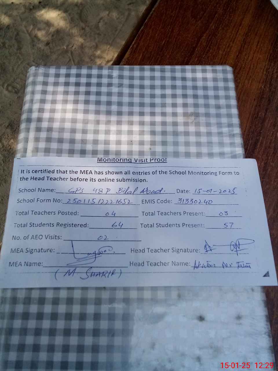 | Attendance Register | Head Teacher | MEA with School | Visit Proof |