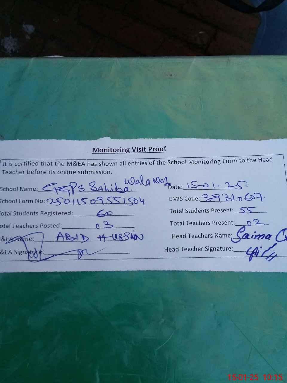 | EMIS Code: 39310607 | Name of School: GGPS SAHIBA WALA NO. 1 | |||