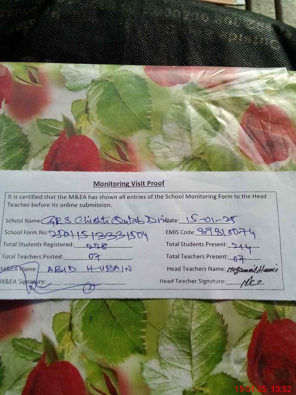 | Attendance Register | Head Teacher | MEA with School | Visit Proof |