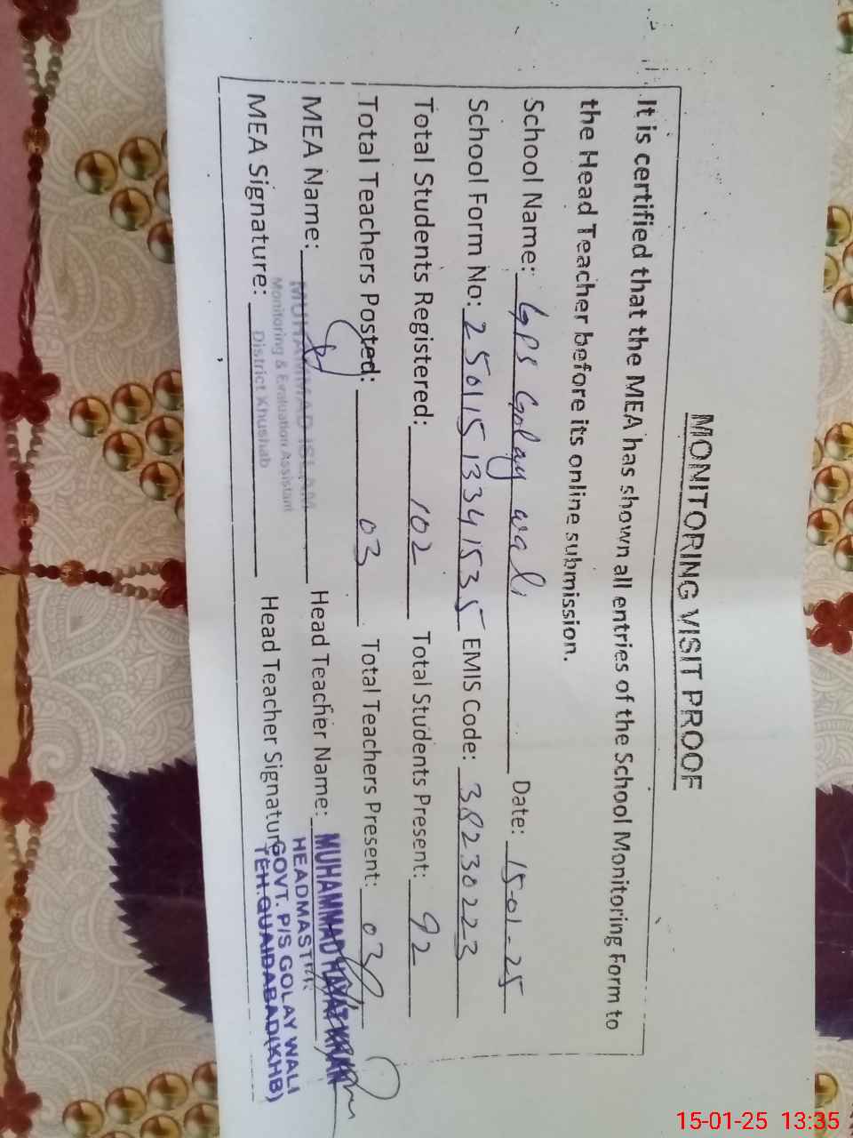 | Certified that this School was Inspected by the Undersigned MEA/DMO Today and the Information Stated Above is as Per Record. | |||||