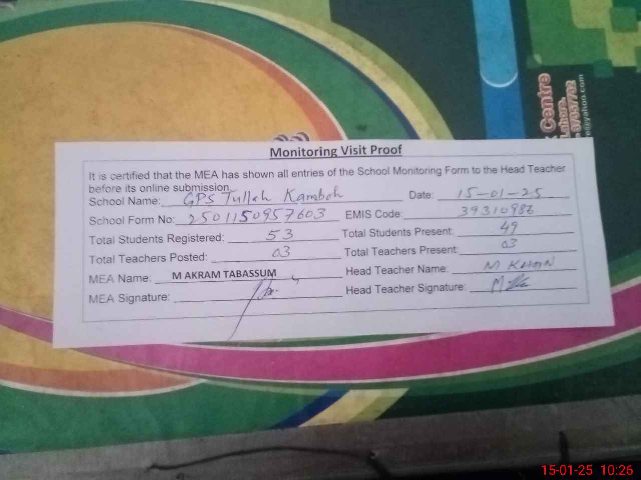| Attendance Register | Head Teacher | MEA with School | Visit Proof |