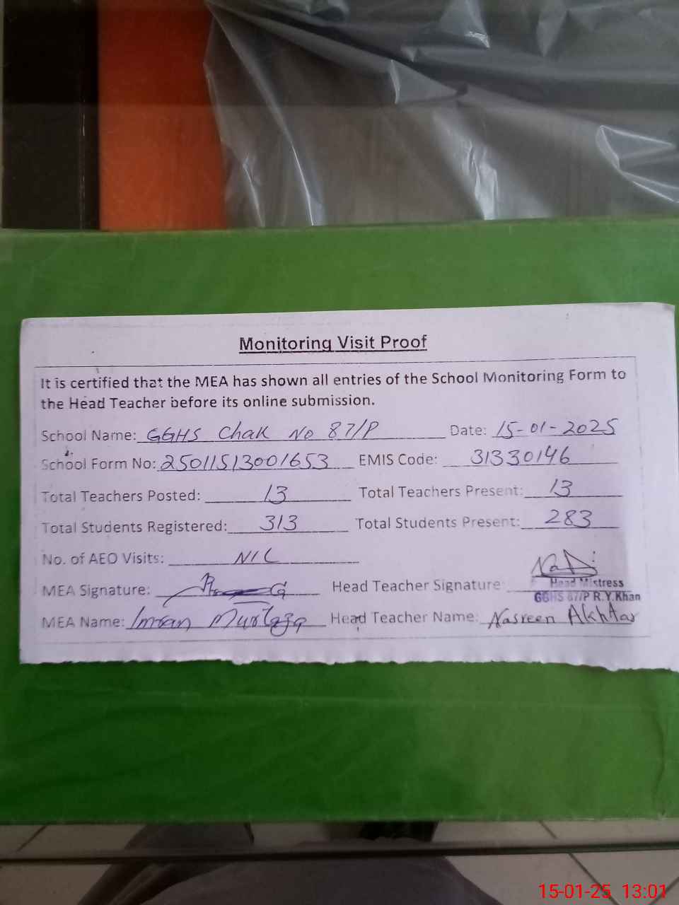 | EMIS Code: 31330146 | Name of School: GGHS CHAK NO. 87/P | |||