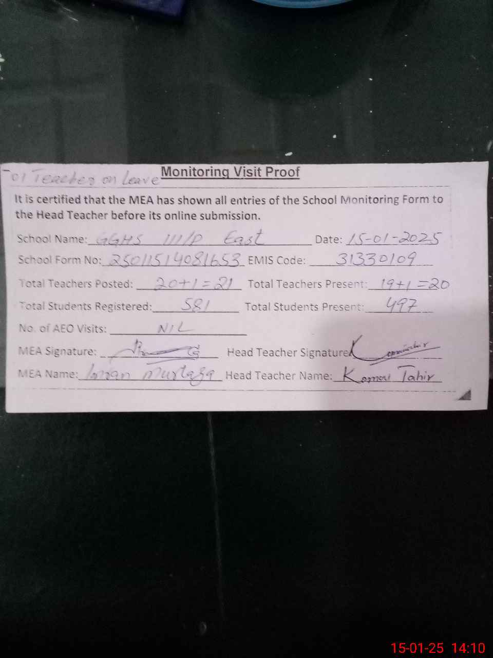 | Attendance Register | Head Teacher | MEA with School | Visit Proof |