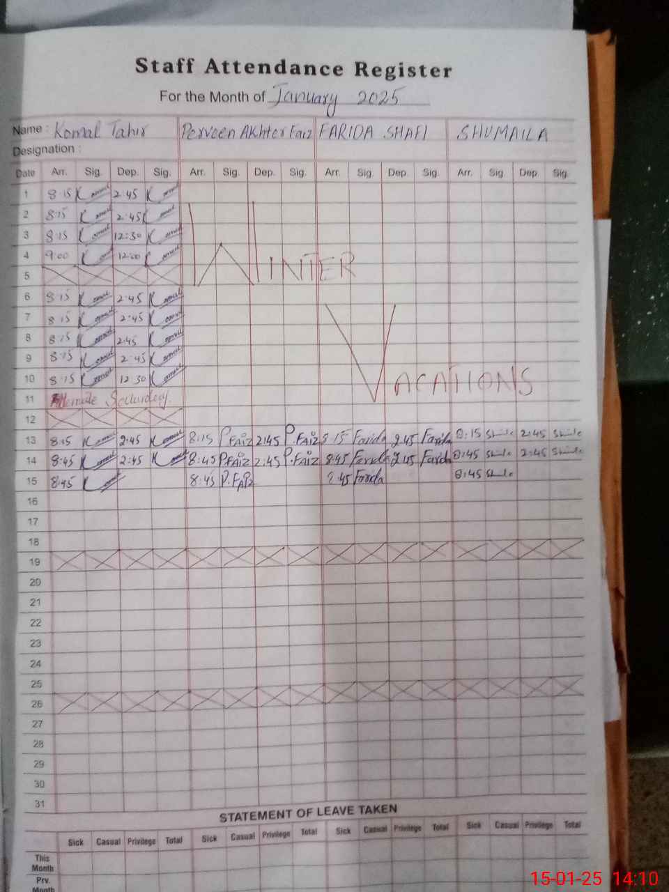 | CNIC | Full Name | Designation | R/C | Absence During Last Calender Month |