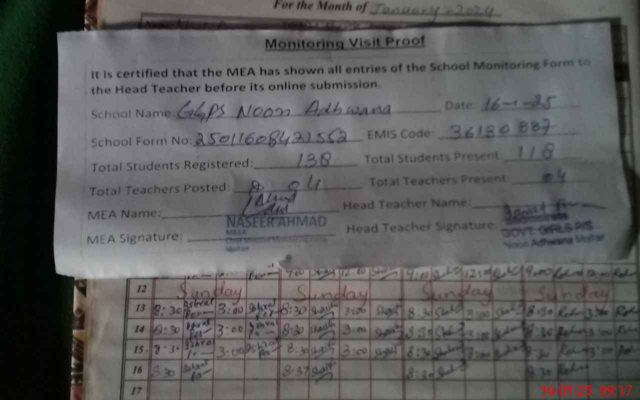 | Monitoring Date: 16-01-2025 | Start Time: 16-01-2025 08:42 AM | End Time: 16-01-2025 09:17 AM | Name of MEA: Na**** Ah**** | |
