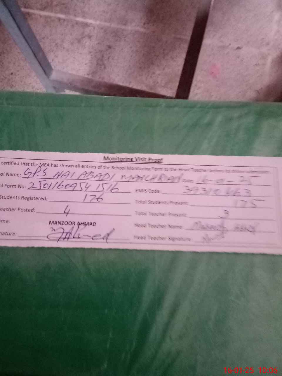 | Certified that this School was Inspected by the Undersigned MEA/DMO Today and the Information Stated Above is as Per Record. | |||||