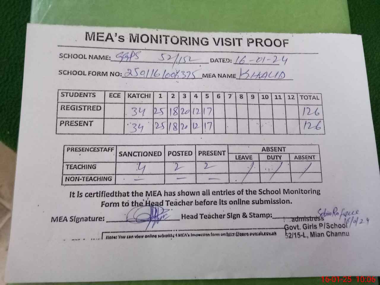 | Attendance Register | Head Teacher | MEA with School | Visit Proof |