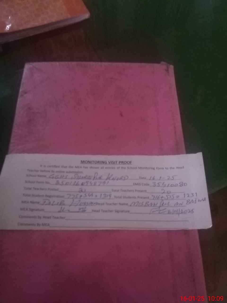 | Attendance Register | Head Teacher | MEA with School | Visit Proof |