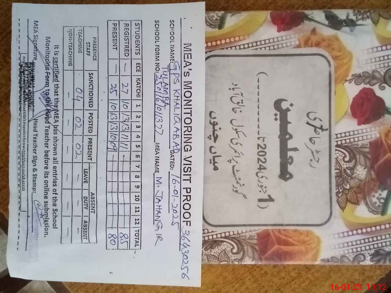 | Attendance Register | Head Teacher | MEA with School | Visit Proof |