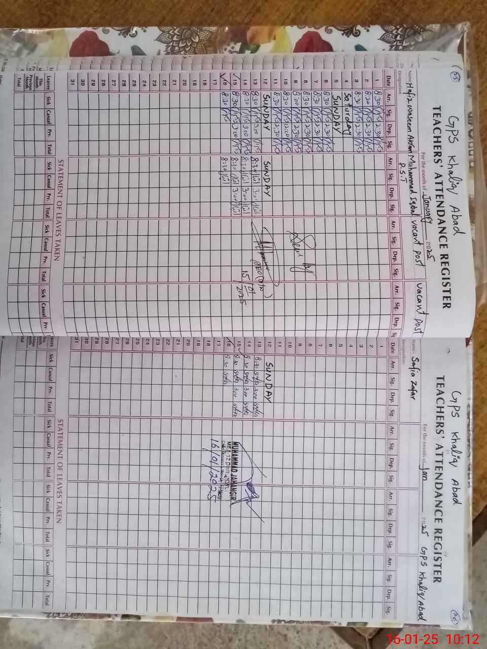 | CNIC | Full Name | Designation | R/C | Absence During Last Calender Month |