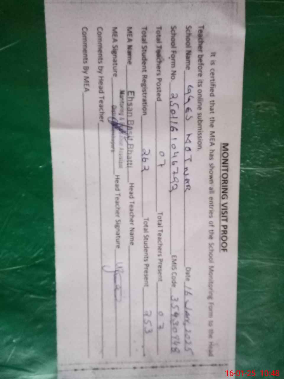 | Attendance Register | Head Teacher | MEA with School | Visit Proof |