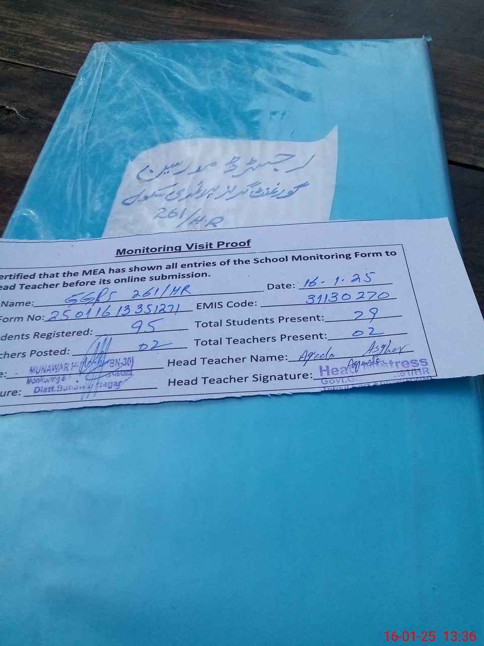 | Attendance Register | Head Teacher | MEA with School | Visit Proof |