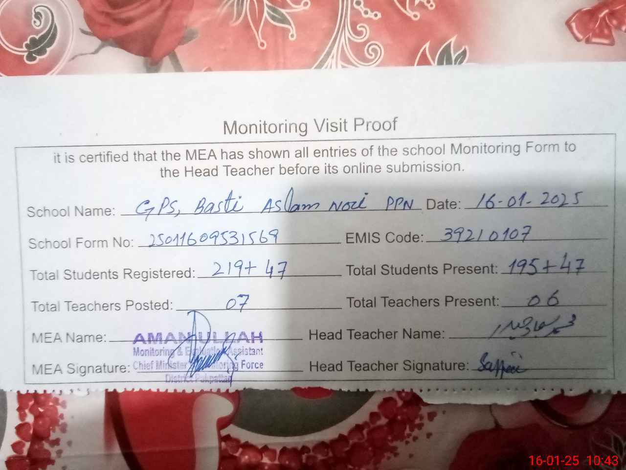 | EMIS Code: 39210107 | Name of School: GPS BASTI ASLAM NOI PAKPATTAN | |||