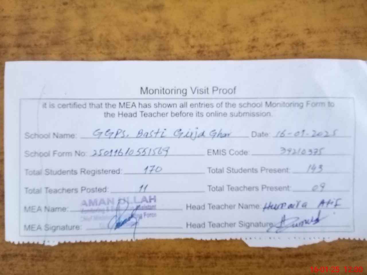 | Attendance Register | Head Teacher | MEA with School | Visit Proof |