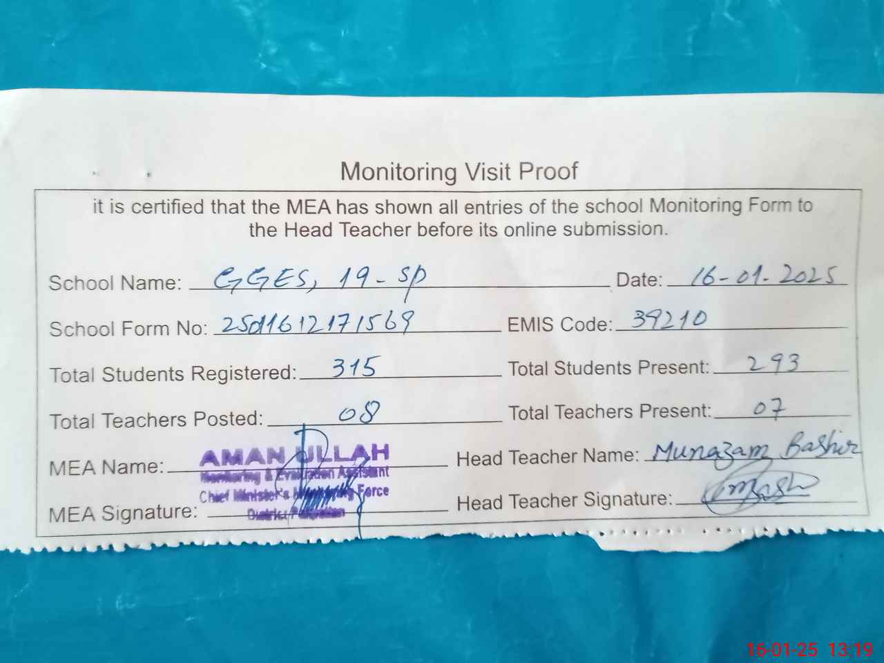 | Attendance Register | Head Teacher | MEA with School | Visit Proof |