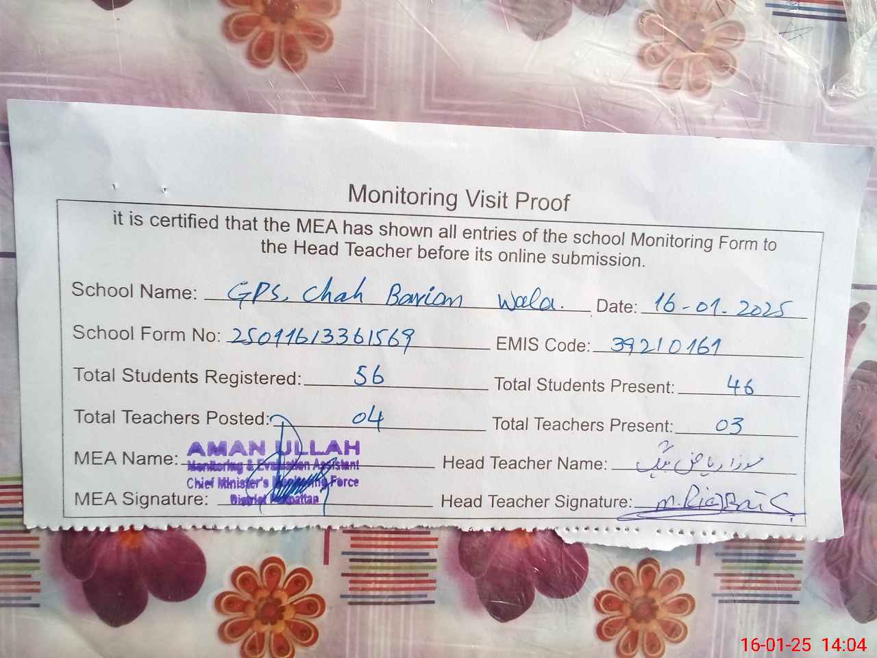 | Attendance Register | Head Teacher | MEA with School | Visit Proof |