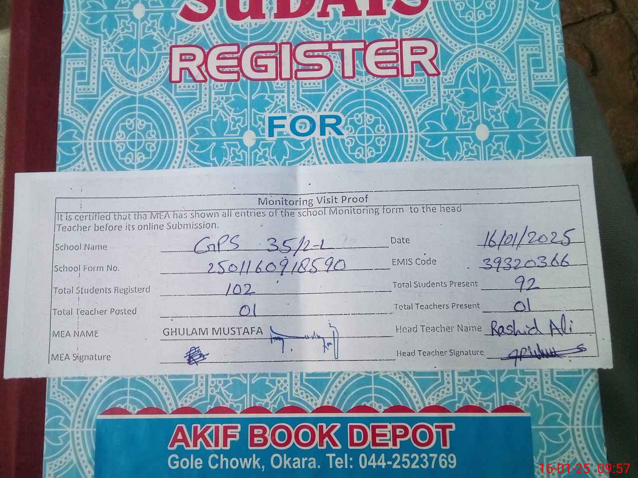 | Attendance Register | Head Teacher | MEA with School | Visit Proof |