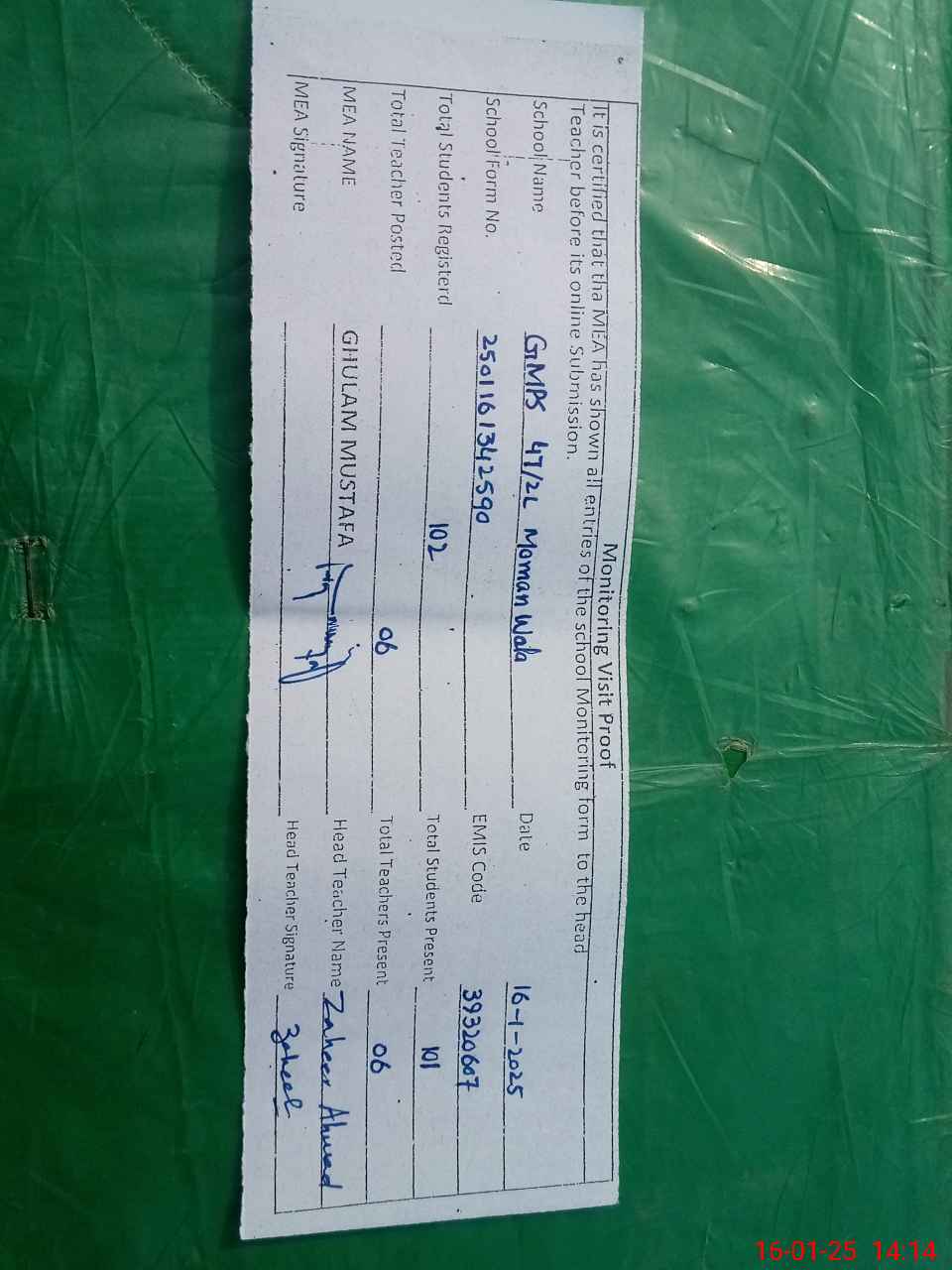 | Attendance Register | Head Teacher | MEA with School | Visit Proof |