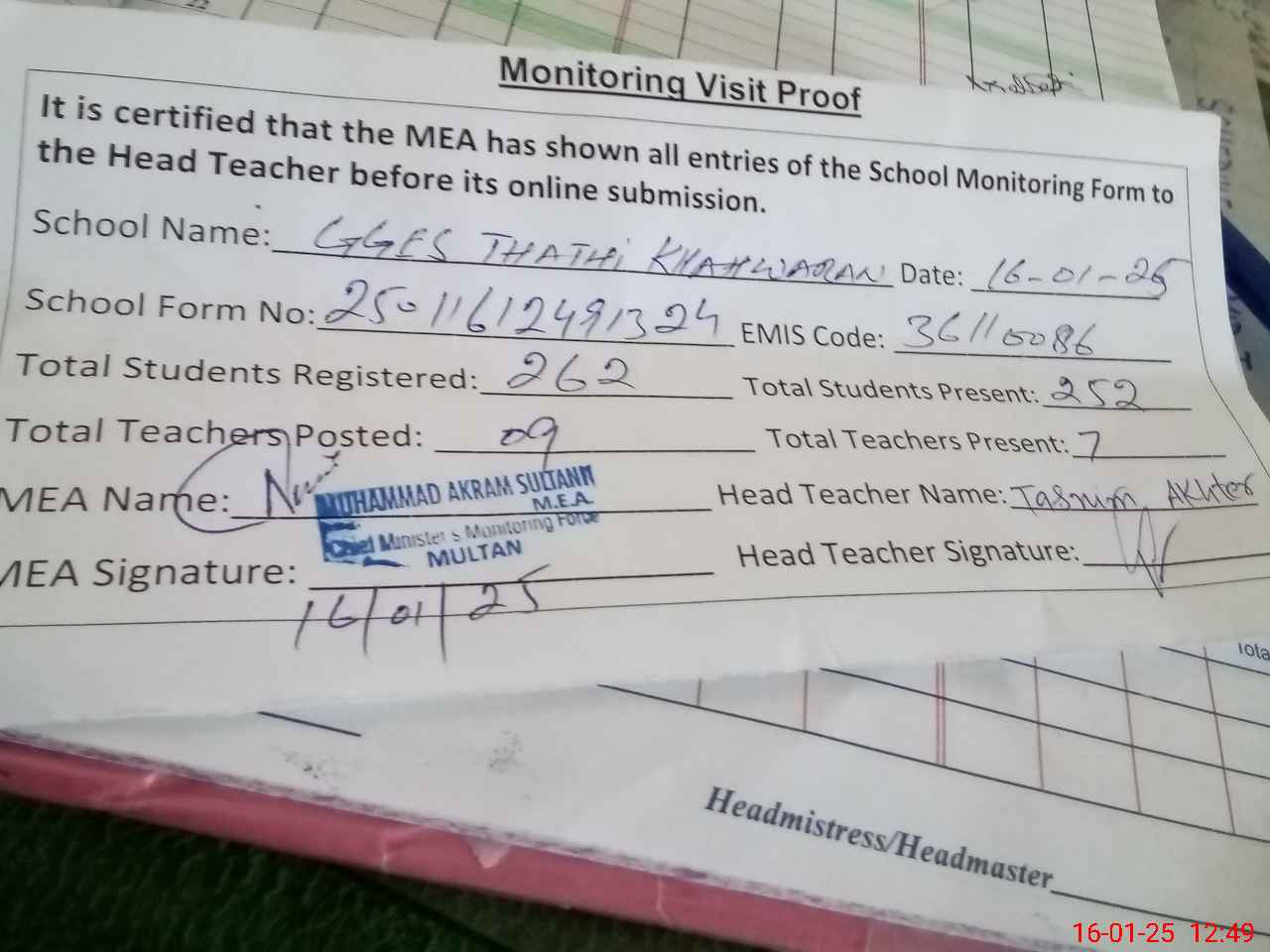 | Attendance Register | Head Teacher | MEA with School | Visit Proof |