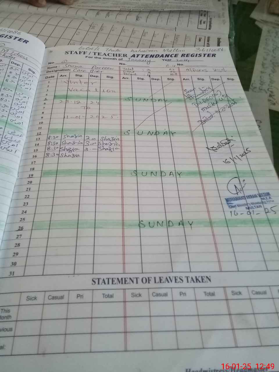 | CNIC | Full Name | Designation | R/C | Absence During Last Calender Month |