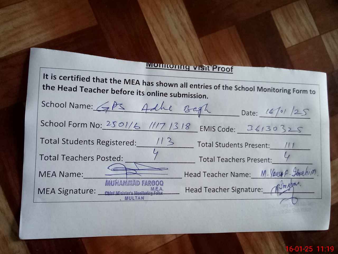 | EMIS Code: 36130325 | Name of School: GPS ADHI BAGH MOZA TARAGARH P/O KHOKHAR | |||